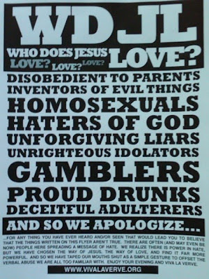 Some people asked for a close-up of the flier we gave out last night. One of the odd things you’ll notice is our choice of words for the types of sin listed. The reason for it is that we exactly copied the list from the “Who Will Jesus Destroy” sign. So it’s supposed to be saying that Jesus loves the exact groupings of people the other dude is talking about…
